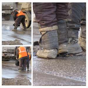 Вот так у нас начали "ремонтировать" дороги. Технология проста до идиотизма - налили в ямку смолу, присыпали старым асфальтом, внимание - притоптали ногами, пошли дальше... Увидев фотоаппарат тормознулись, начали тянуть время, потом всё таки продолжили, "прикрыв" от меня яму ногами)))